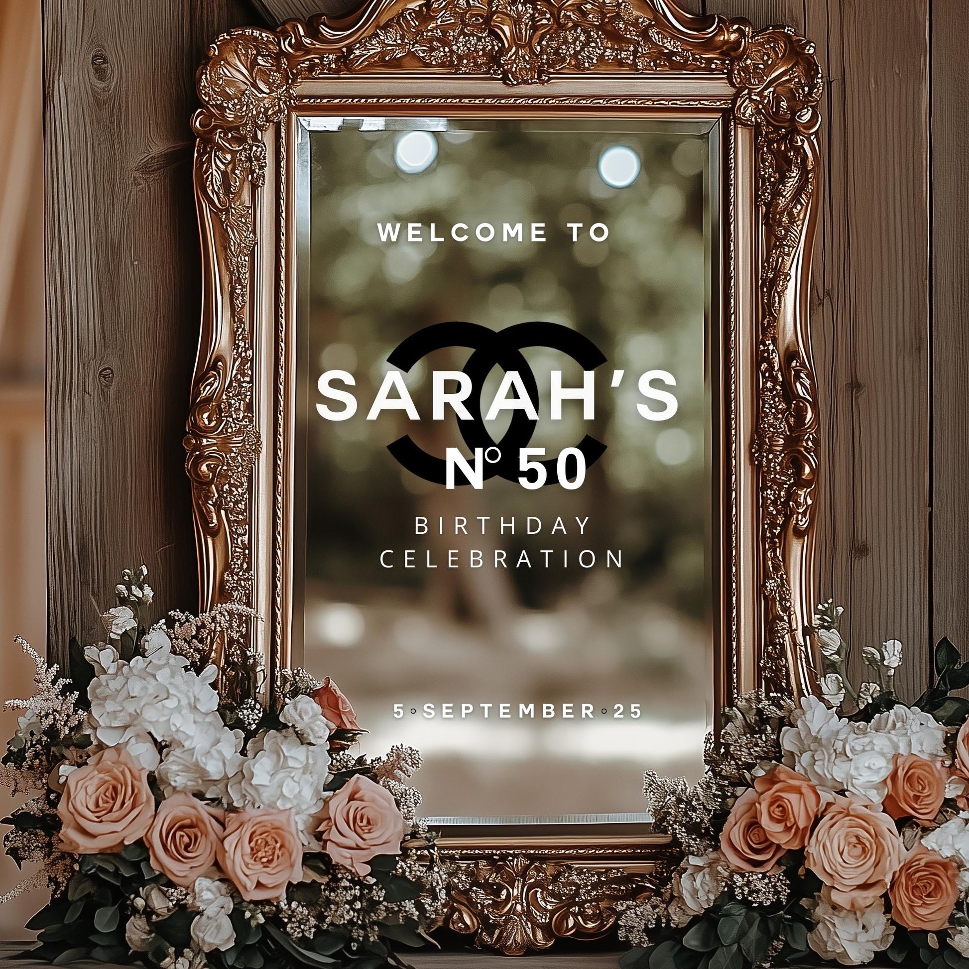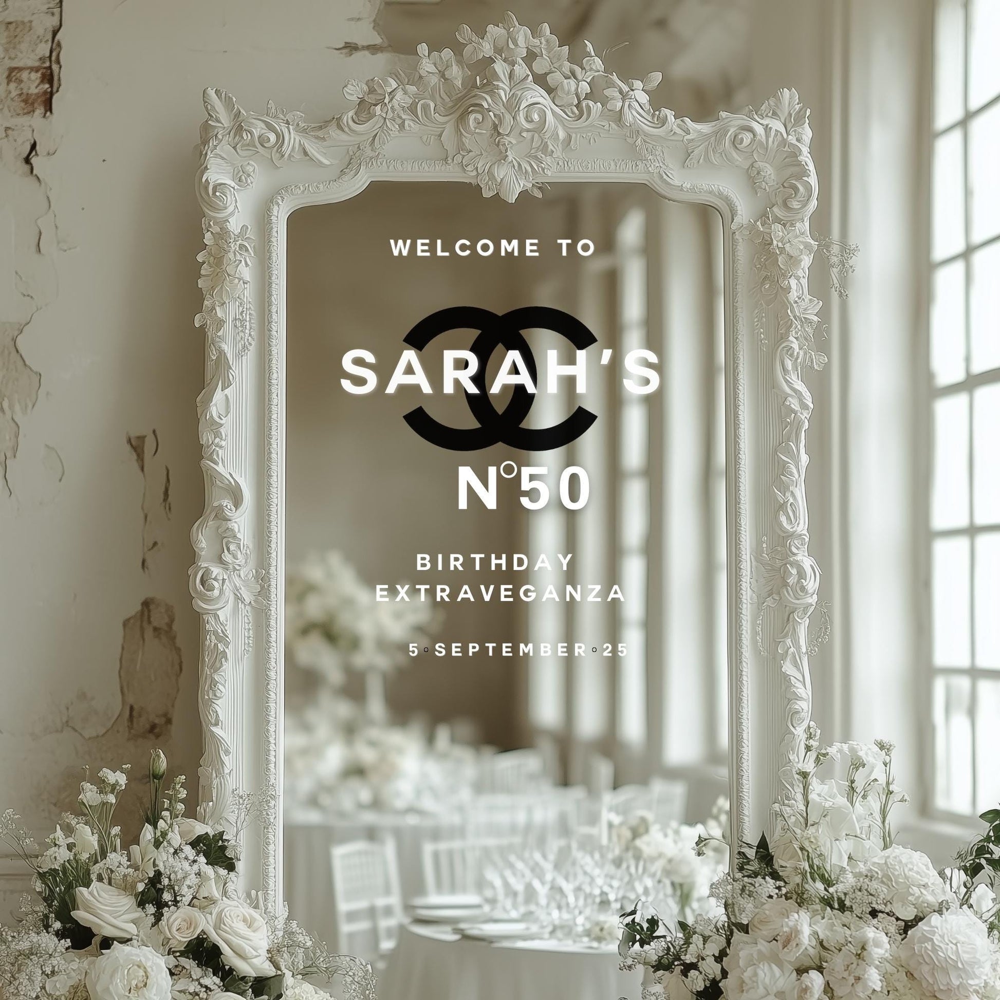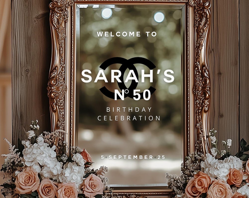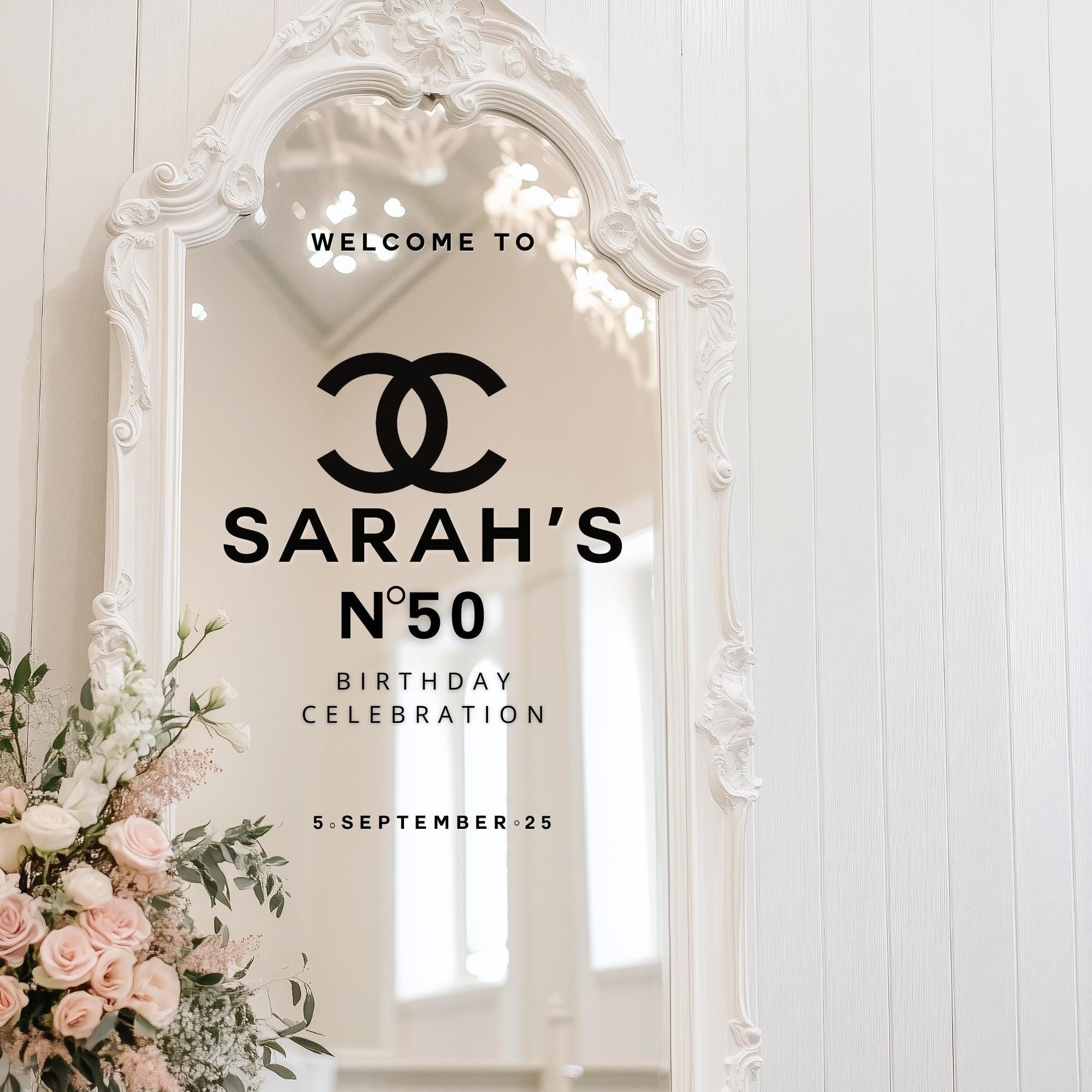 Welcome to a 50th Birthday Celebration | Custom Selfie Mirror Decals | Birthday Decor | Removable Vinyl Sticker | Chanel N0. 5 Theme