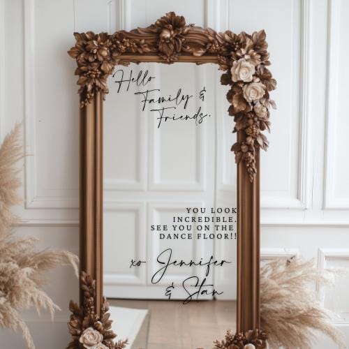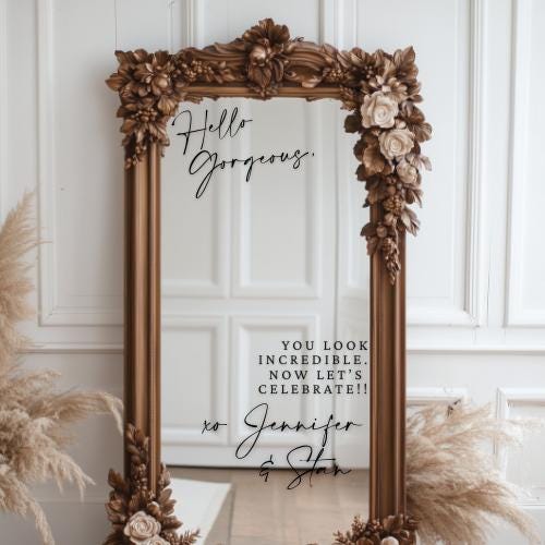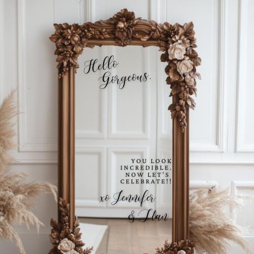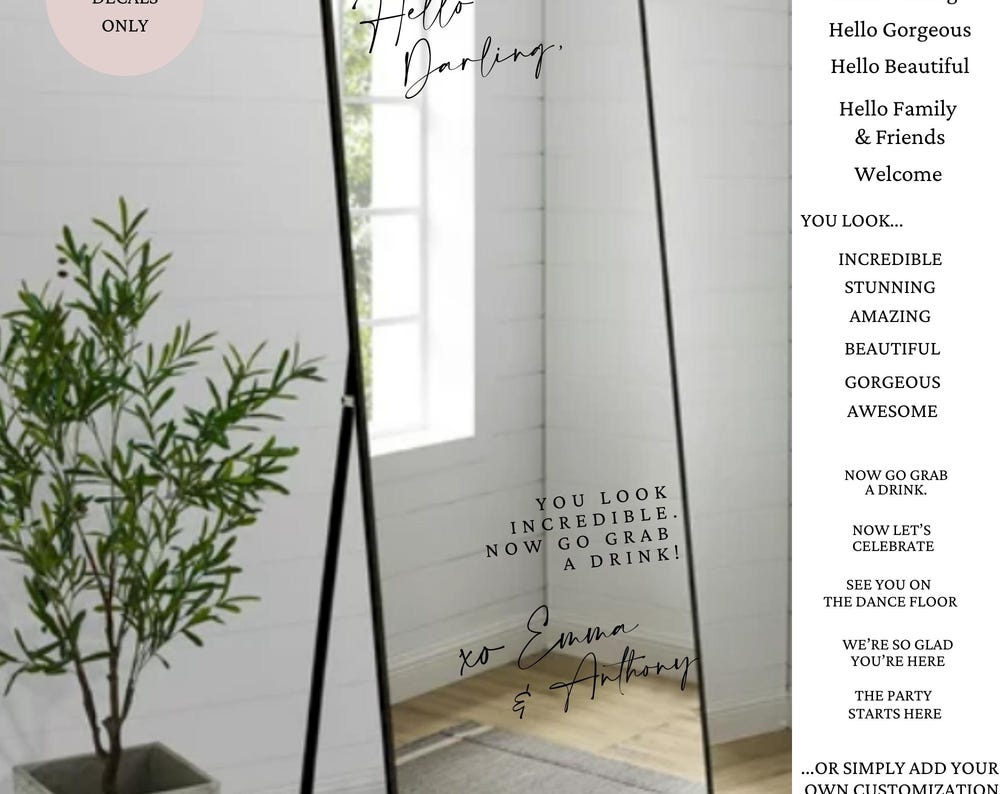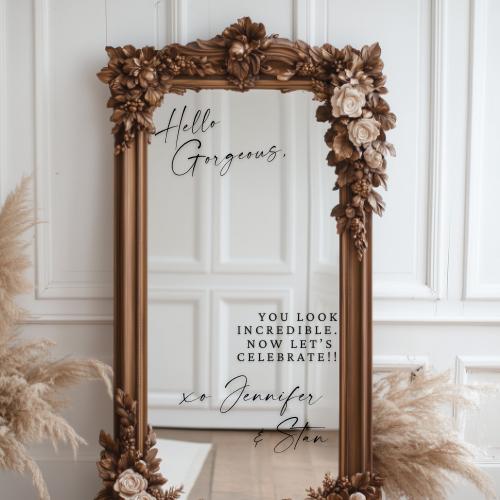 Add a fun and personal touch to your wedding entry with these custom vinyl decals! Perfect for all occasions, these removable selfie mirror stickers make greeting guests easy and stylish. Easy to apply and remove, they’re hassle-free decor that keeps your celebration bright and memorable without any sticky mess afterward. Make your big day uniquely yours with playful, personalized charm!